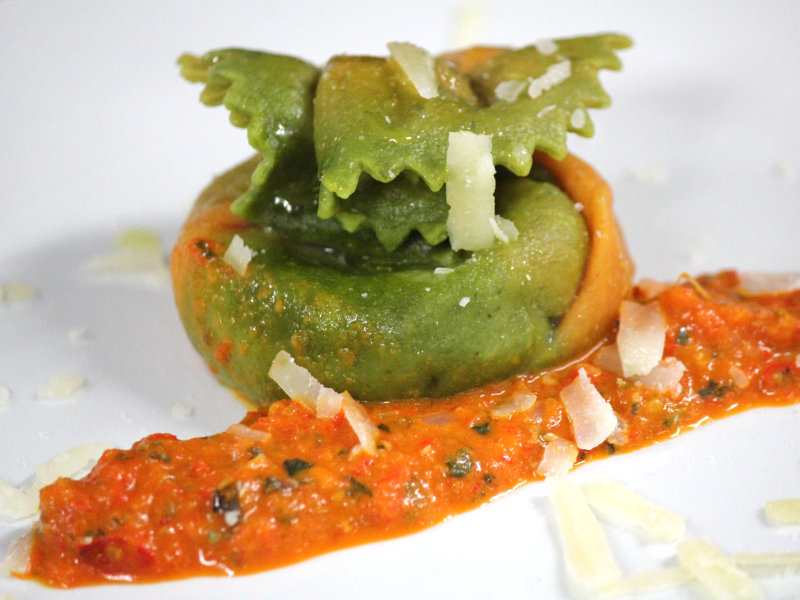 - Stripey bon bon pasta with a sundried tomato and mature cheese filling, accompanied by a sweet pepper & mint sauce
